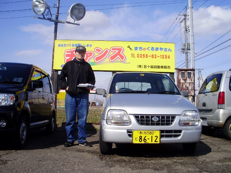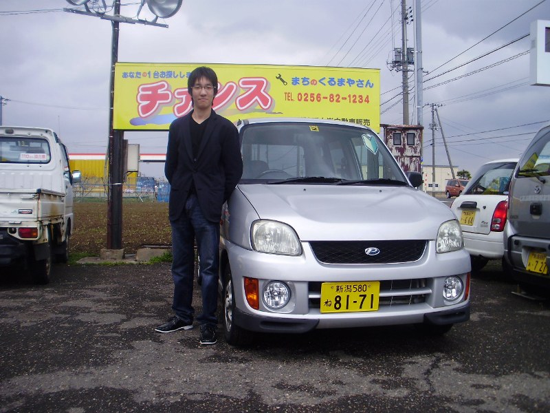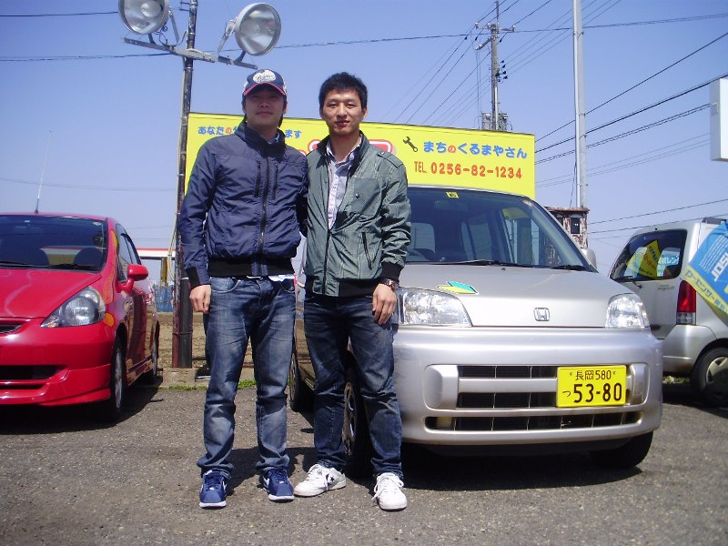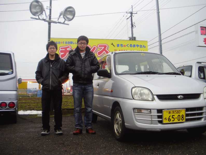 遠く、山形県からのお客様です。4WDのプレオで安いものを探しにはるばるお越しになりました。ご本人様は右側の方ですが当店までいっしょに来ていただいた左側のお客様は岩手県のお友達だそうです。またネットで格安カーを探しに来てください。この度は誠にありがとうございました。 |