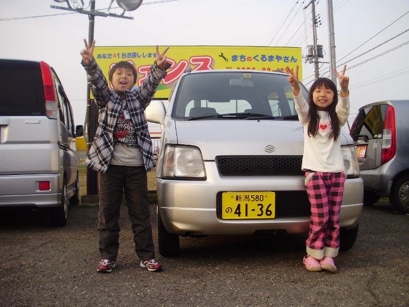 ここに登場してくれたのはとっても元気なお孫さんのお二人です。お車はおじいちゃんに購入していただきました。納車の際、いっしょについてきてくれました。今度はおとうさん、おかあさんのお車もチァンスでお願い致します。この度は誠にありがとうございました。 |